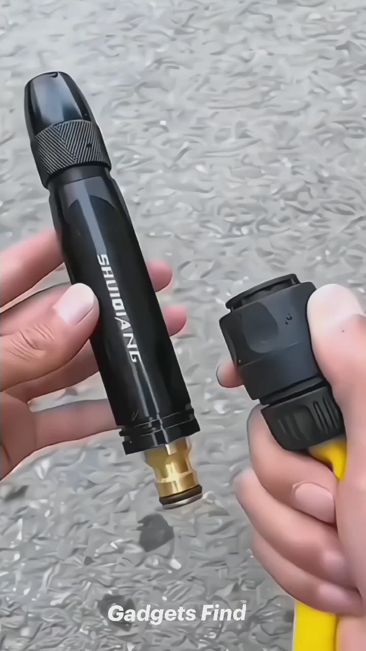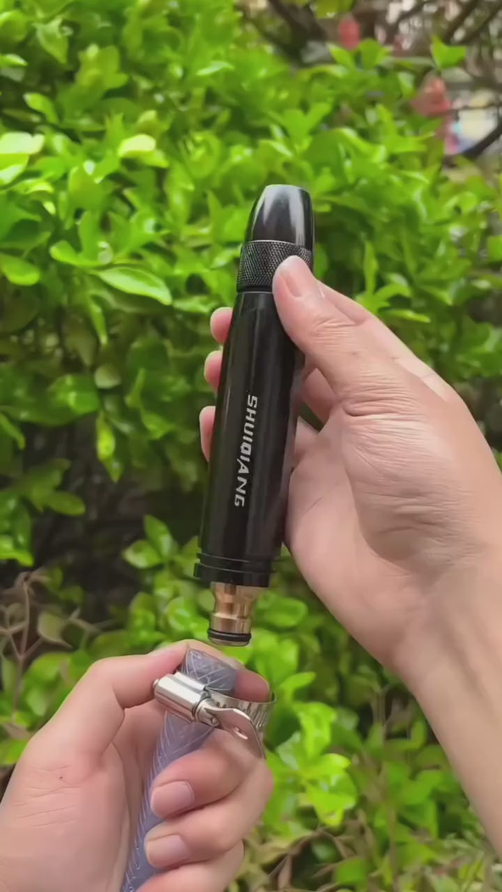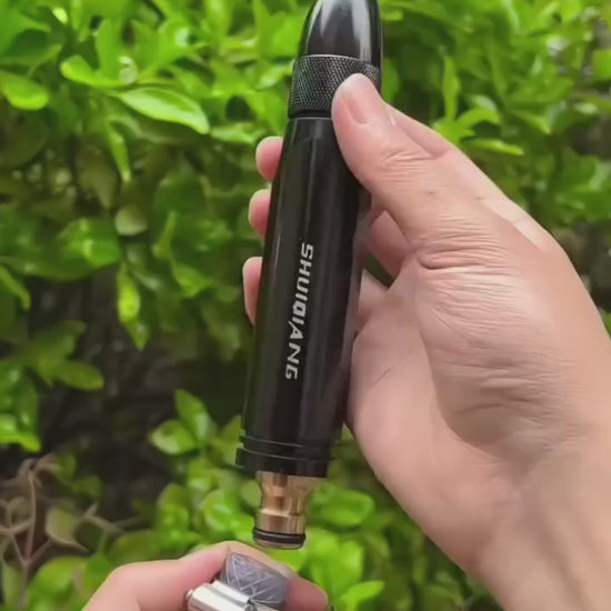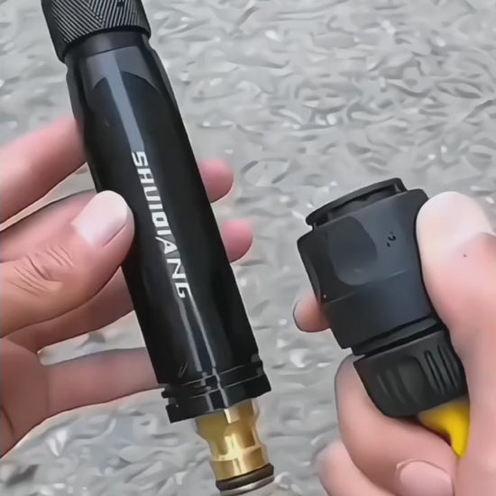 A high-pressure water nozzle in sleek black design that transforms any regular hose into a cleaning powerhouse for outdoor use.